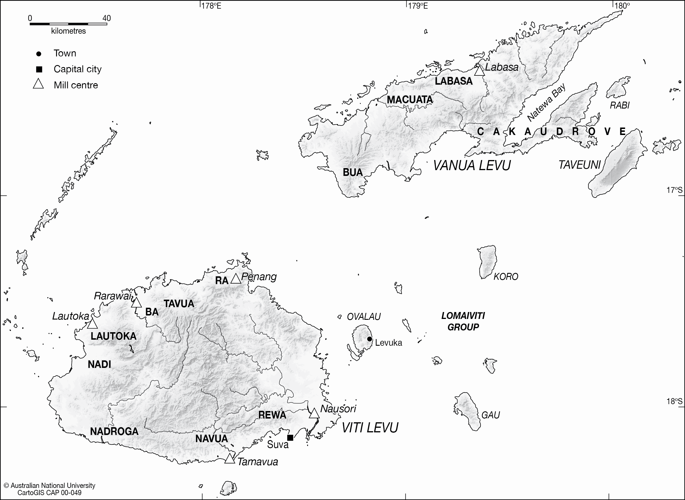 Relief map of Viti Levu, Vanua Levu, Lomaiviti Group and Taveuni.